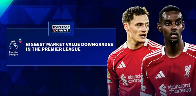 北京时间12月9日,在更新了英超球员的身价之后,德转还列出了此次更新后身价跌幅最大的10名球员,伊萨克和维尔茨下跌2000万欧元为所有球员最高,在跌幅最高的5名球员中,本赛季成绩不佳的利物浦占据了4席。